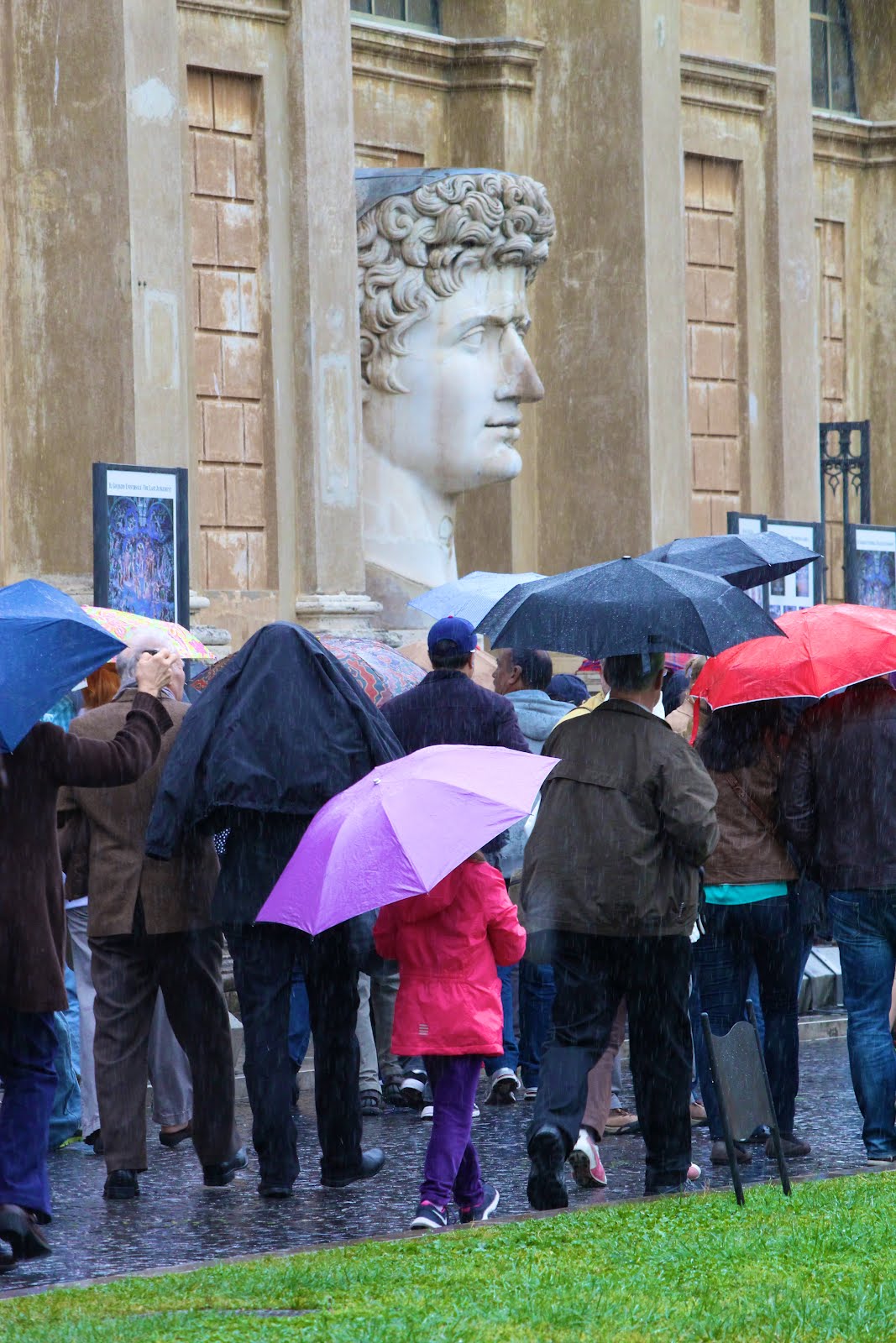 By the time we get to the Forum, it is pouring with rain and my boots are leaking. We battle through rivers of muddy red water, unsuccessfully trying to avoid puddles. All around us lie the half restored ruins of ancient temples. We walk down the main road, and I can imagine life as it might once have been, a row of temples to a variety of Gods, each fronted with soaring columns, standing tall and proudly over its people.