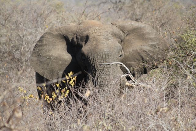 We came across three elephants yesterday, standing like dark giant rocks in the grey sea of winter trees. Close enough to see their eyelashes, thick and long, protecting brown pools of intelligence – eyes that stare at you soulfully. As tall as the Landrover and nearly as wide, they move with a silence that seems unbelievable. Turning off the engine, the only thing you can hear are the swish of their trunks as they pull the grass out of the ground and shake it about to dislodge the earth before eating it. My heart is always pounding to see elephant that close up. But what a treat it is. They are the real king of the bush, regal and serene, but when disturbed or upset, they can react with deadly intent. Not fast enough to escape a bullet though. Not fast enough to protect themselves from man’s never-ending self-obsessed talent for destroying beauty and life and wonder for the sake of ego.
