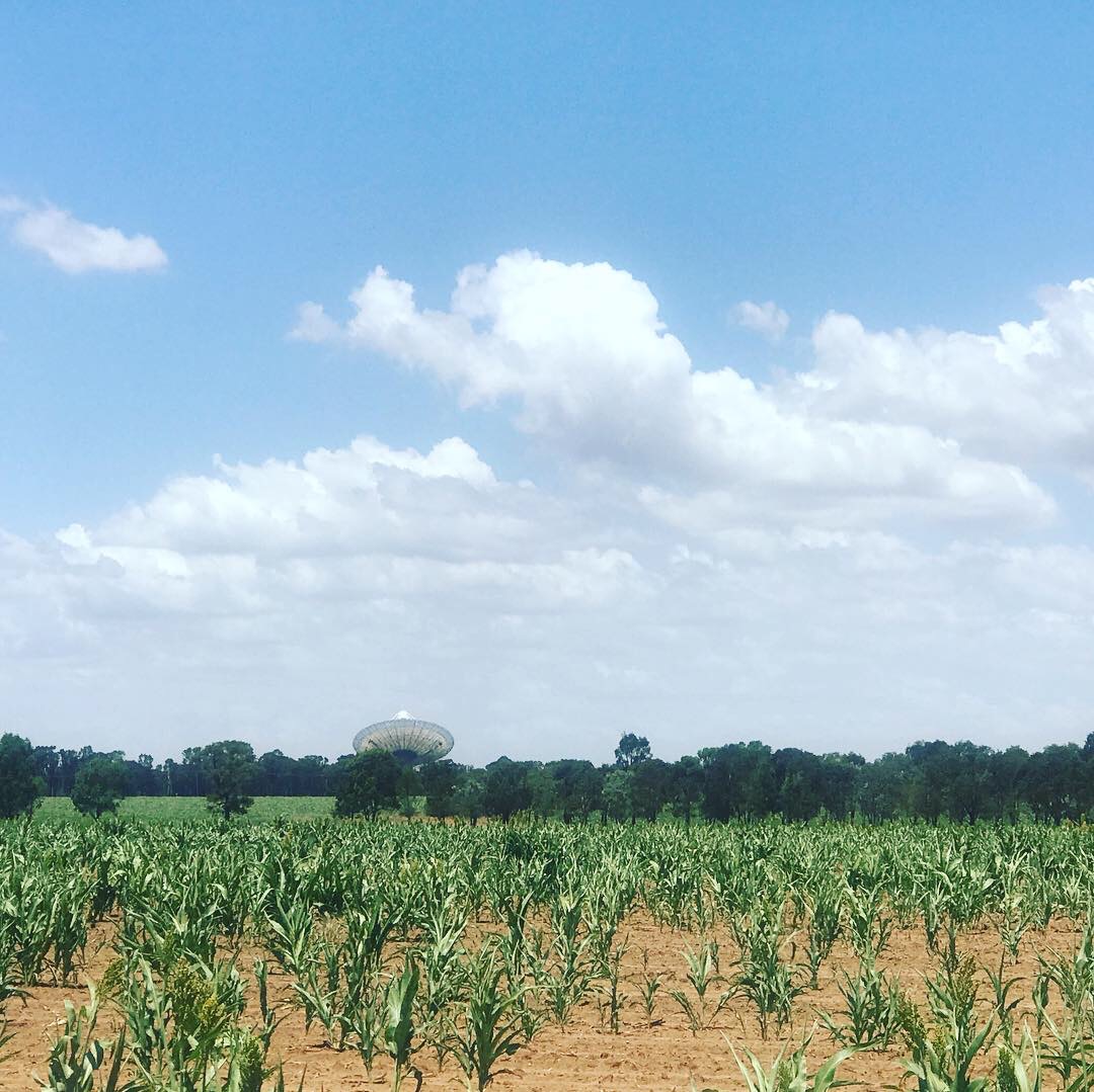 It is quiet here, away from our noisy society, and that’s important if you are a radio telescope. All around us, the landscape stretches flat to the edge of the horizon. Peaceful and serene. Green paddocks, blue skies, red earth and an ear to the Universe and the possibilities of tomorrow.