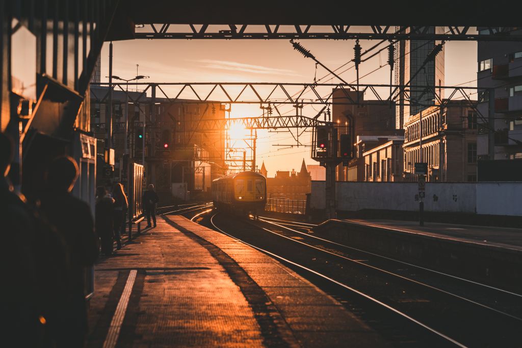 The rhythmic clicking of machinery in action The beating heart of progress Slows to a reassuring hum And with a screech and the slight bump of inertia we arrive at a brightly lit station