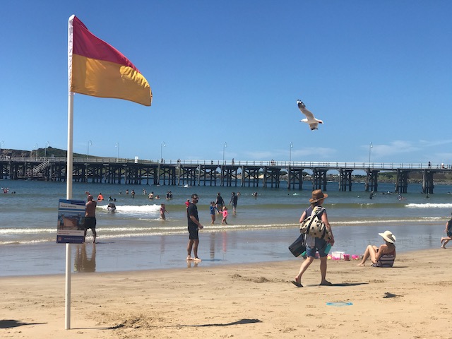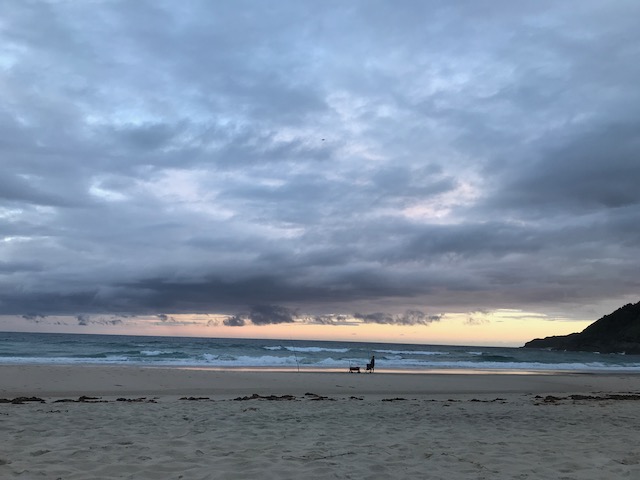 Chill day, beach day – sand and sea and surf. We start early, the pair of us “parentals” with an earlyish walk, coffee overlooking Nelson Bay and a swim in waters of aquamarine. Then it’s down to the beach, while the kids and Mike go out in a tinny to do some fishing and, accidentally, a spot dolphin gawking. Arabella sees them with her sharp eyes.