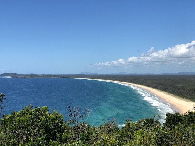 Sometimes you come across a view so spectacular it leaves you short of vocabulary. Such is the panorama from Crescent Head lookout – high above the seaside village and the surfers who appear the size of ants. The deep blue ocean spreads before us from north to south and all the way to the horizon where it meets the sky – today crisp and clear and eternal.