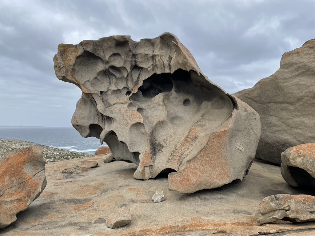 We drive down to the other end of the island, to the fire ravished Flinders Chase National Park. I can’t imagine what this placed looked like before last year’s fires ripped through this half of the island, taking 98% of the park with it. But for now, it is lush with low growth – a sea of green and budding life that stretches out until the sea. It is for the rocks we’ve come though.