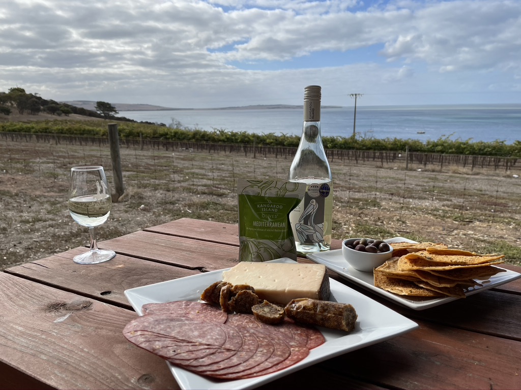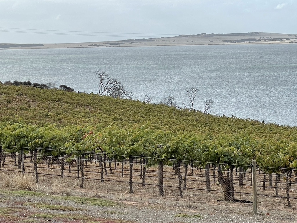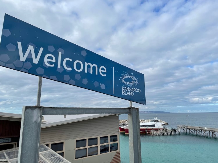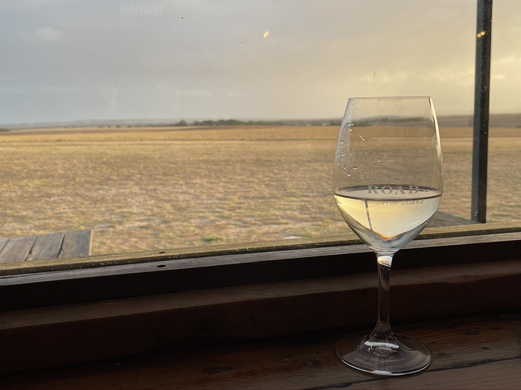 It’s a two hour, largely smooth, flight to Adelaide and then an 80 minute drive down the ferry to Kangaroo Island. The landscape we drive through is brown and dry; large, rounded hills that seem covered in a mousy coating of dried grass. But they fall off into a sea of startling turquoise, and between them are lush moments of greenery and endless vineyards too that are still heavy with tinges of burnt umber autumnal leaves.