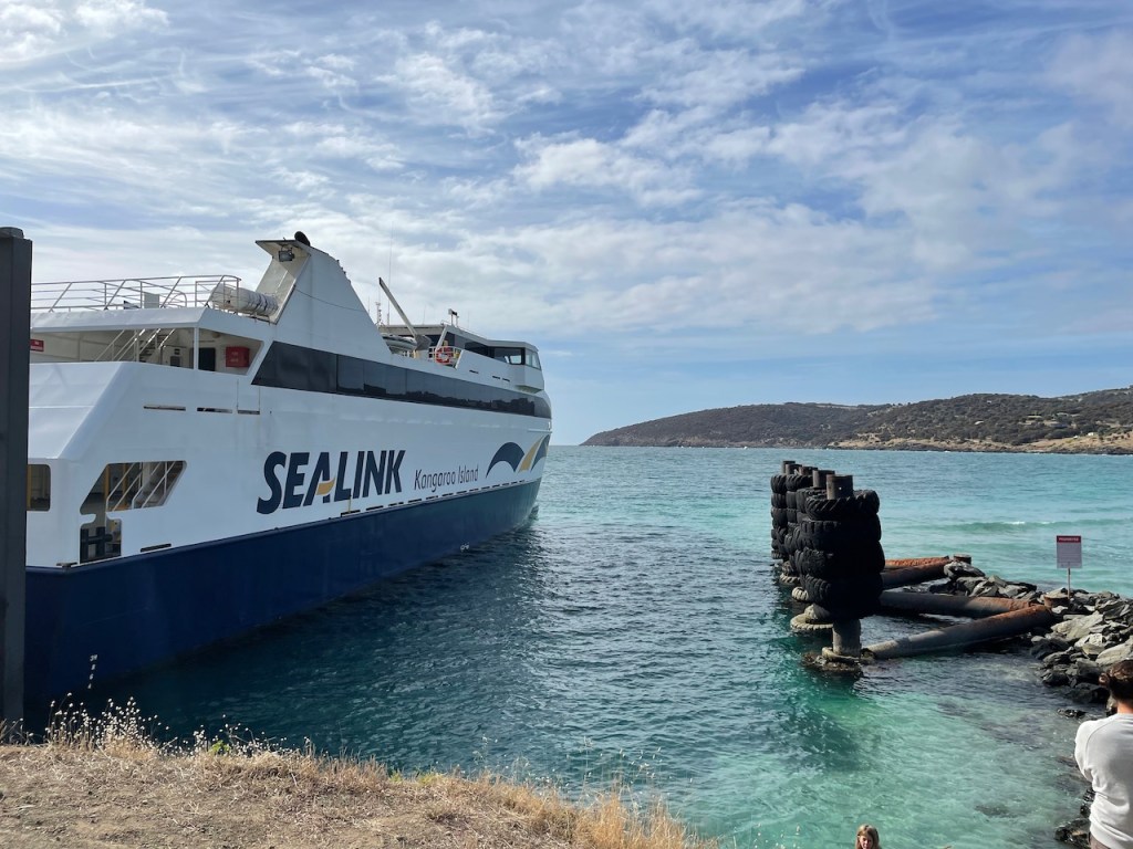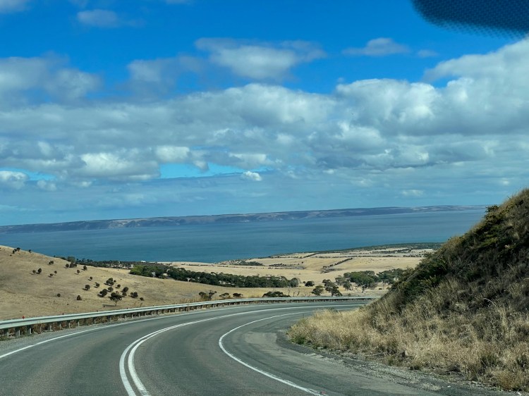 The ferry ferries (!) our car and several trucks and caravans across an aqua sea towards Australia’s third biggest island, for now merely a brown smudge on the horizon. The boat trip is smooth and the lunch we gulped down during a whistle stop visit to Victor Habour remains safely where it belongs. (Not so on the way home, although being outside to avoid seasick vomiting meant I saw the dolphins).