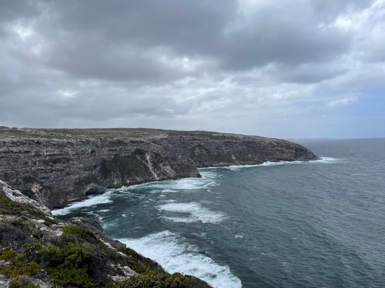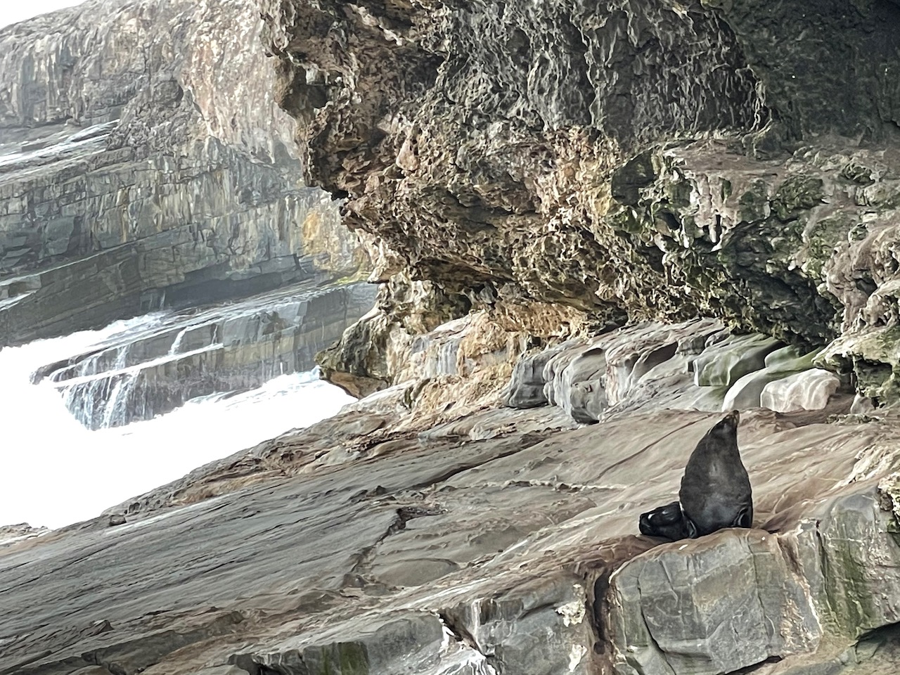 Admirals Arch is impressive, but it is the seals and sealions that really get our attention. Lollying over rocks they are at first hard to spot. But once we see one, we see that the rocks below seethe with them – different shapes, shades and species. Little ones cavort endlessly, falling into the crashing waves and chasing each other through the sea spray, while fat and tired mamma’s take in the sunshine. It is cold here on this peninsula that stretches into an ocean that bumps up against Antarctica. The wind howls in our ears and tugs at our jackets, and whips our hair into a birds nest of knots.