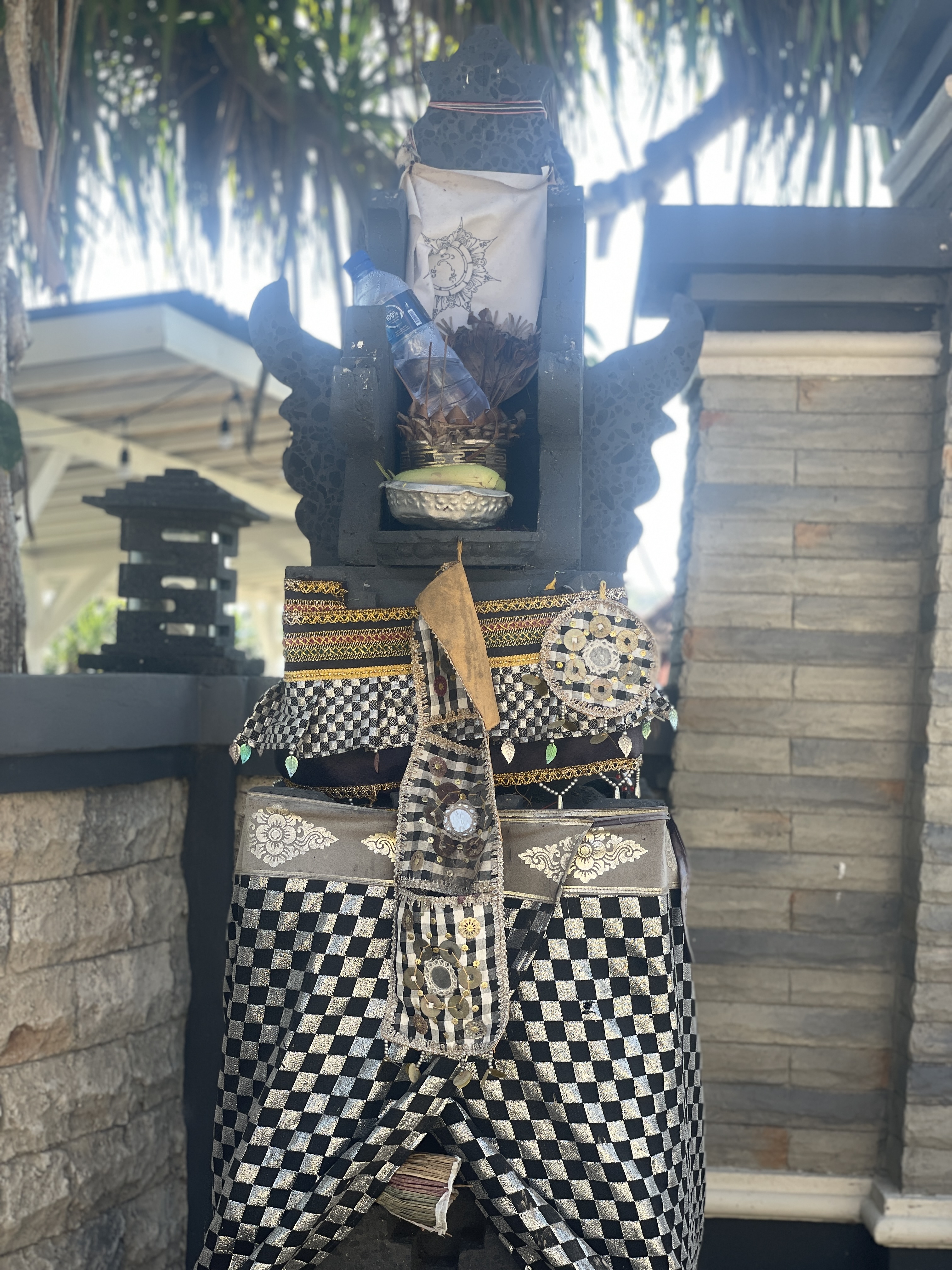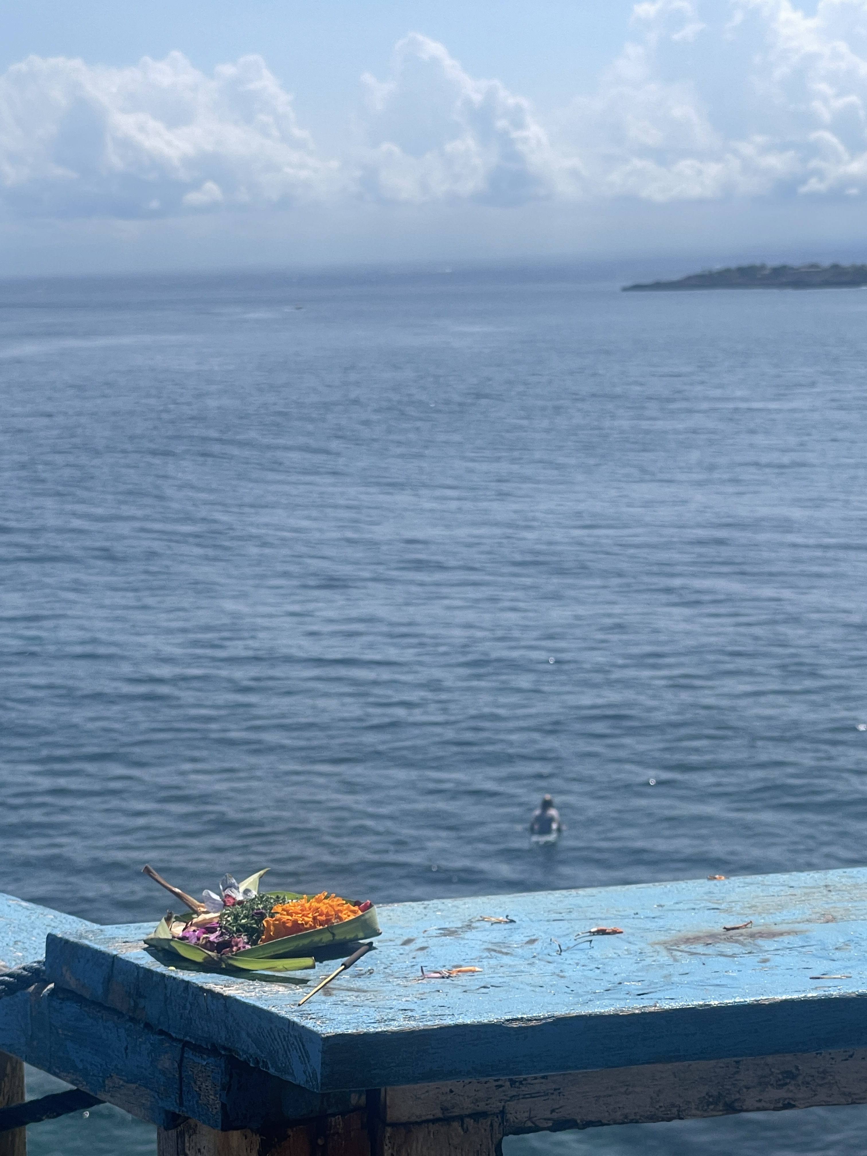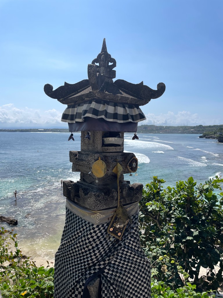 Breath in. The air smells of ocean and incense. Everywhere lie the remnants of offerings – a basket weaved out of banana leaf, and some brightly coloured flowers, nuts, or trinkets. In a few cases a cigarette, or a stick of incense long burned out. They are placed in the mouths of the shrines that crowd every inch of the island. On road corners, and every entrance to villas or restaurants or beaches or shops. Granite black or grey blocks, square and sharp, stacked on top of each other to support a little alter, covered with stone and in some cases an umbrella. They’re all subtly different, it seems. Some are reminiscent of houses, others bring to mind a lion’s mouth.