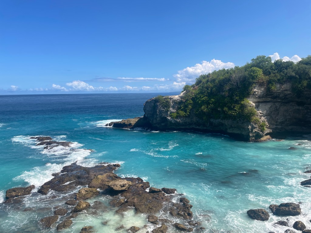 We are on a small island off the coast of Bali. Remote times two. It’s nice and warm here. The sea and pool both a balmy 27 degrees. The sun warm enough to make Sydney’s cold winter grip feel like nothing but a distant memory. If we leave the poolside, it’s to watch the sunset with a cocktail in hand, swimmers still on. And to eat, of course. The fish is divine – fresh out the ocean. And we’ve devoured a bellyful of Nasi Goreng and Chicken Satay (sate, on the menu).